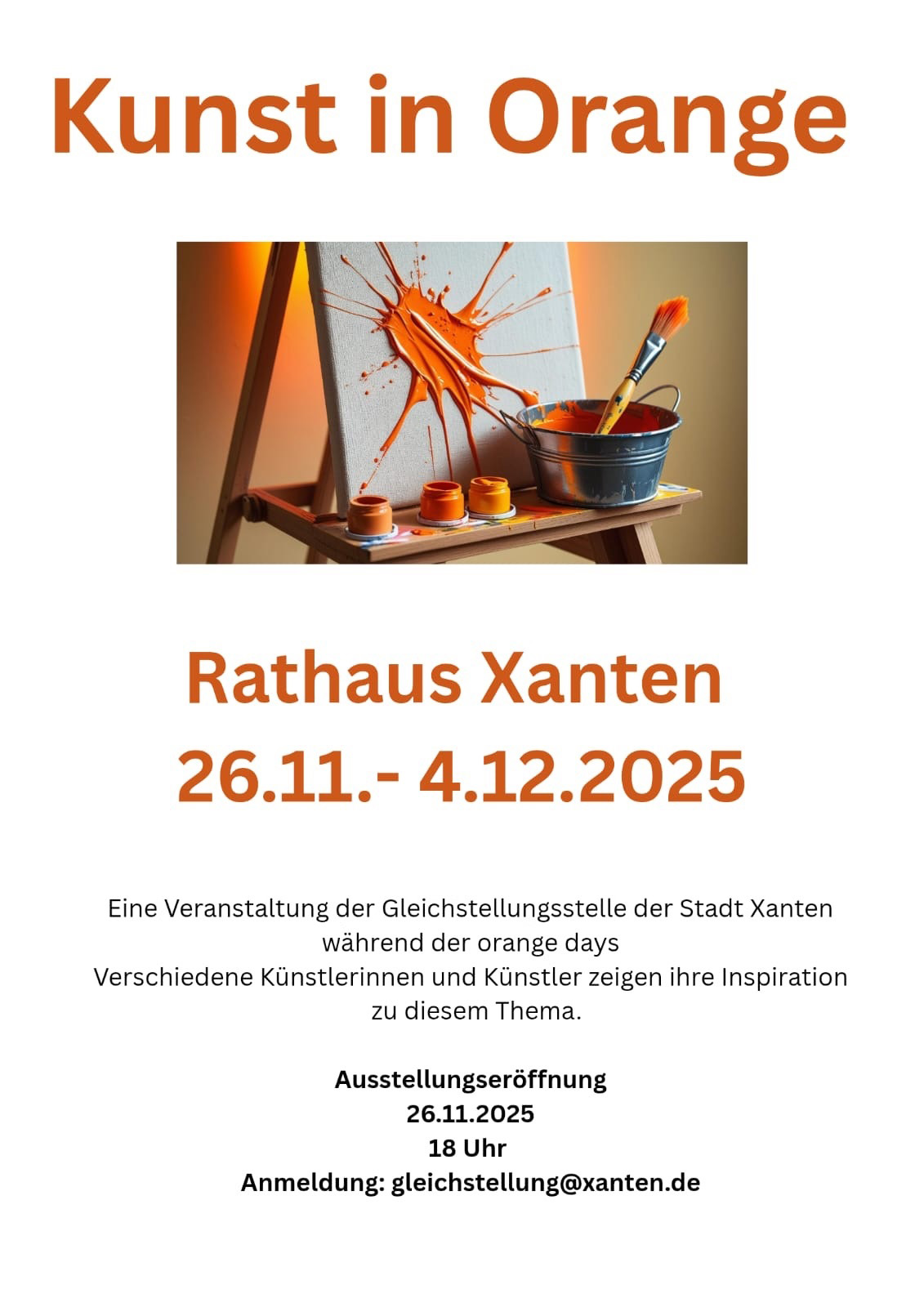 Eine Veranstaltung der Gleichstellungsstelle der Stadt Xanten während der orange days. Verschiedene Künstlerinnen und Künstler zeigen ihre Inspiration zu diesem Thema.